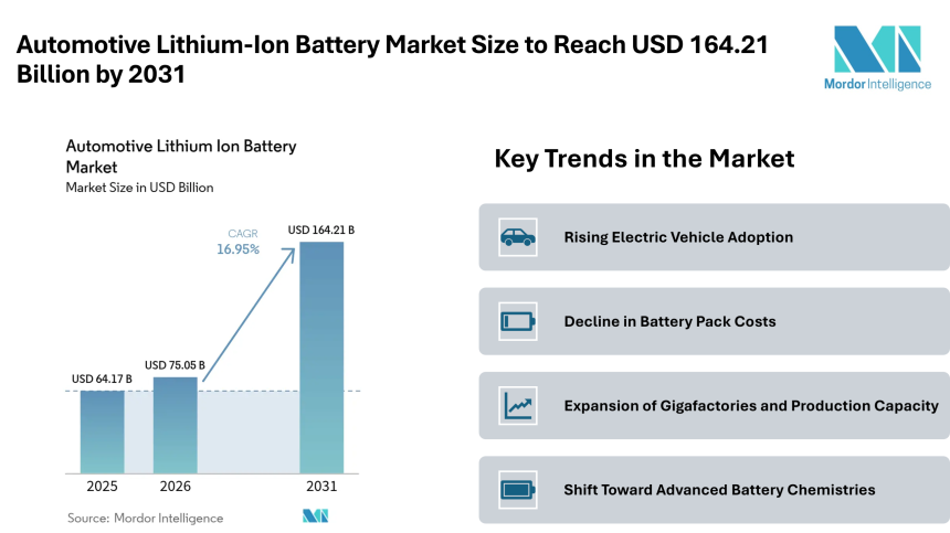 Reading: Automotive Lithium-Ion Battery Market Size to Reach USD 164.21 Billion by 2031 Driven by EV Adoption – Mordor Intelligence