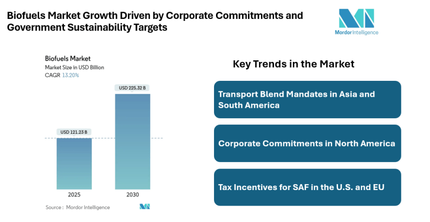 The global biofuels market is set for strong growth, with its size projected to expand from $121.23 billion in 2025 to $225.32 billion by 2030, registering a 13.2% CAGR 2025-2030. This expansion reflects the increasing role of biofuels in meeting decarbonization targets across transport, aviation, and marine sectors.
