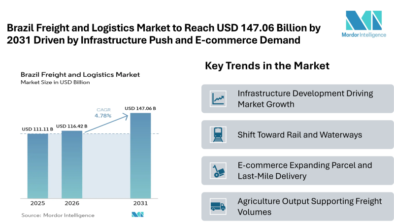 According to Mordor intelligence, the Brazil freight and logistics market size is estimated at USD 116.42 billion in 2026, rising from USD 111.11 billion in 2025, and is projected to reach USD 147.06 billion by 2031, growing at a CAGR of 4.78%. This market growth reflects ongoing improvements in transport systems and increased demand for integrated logistics services. The market continues to expand steadily, supported by infrastructure spending, strong agricultural output, and growing online trade.