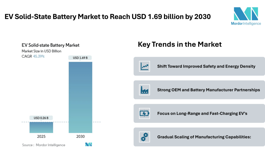 Benelux Times™ > Blog > Uncategorized > EV Solid-State Battery Market to Reach USD 1.69 billion by 2030, Driven by Safety-Focused Designs and OEM Integration – Mordor Intelligence