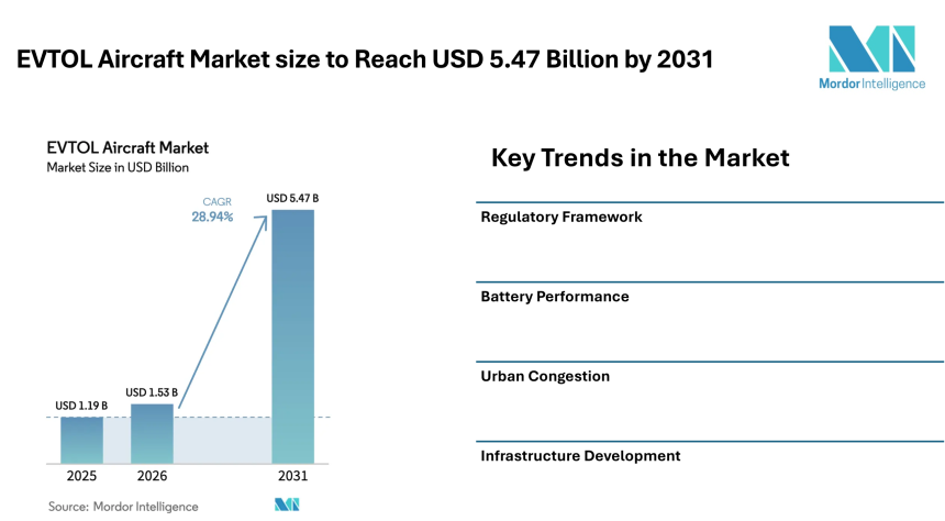 According to Mordor Intelligence, the eVTOL aircraft market size is expected to grow from USD 1.19 billion in 2025 to USD 1.53 billion in 2026 and is projected to reach USD 5.47 billion by 2031, registering a CAGR of 28.94% during the forecast period.