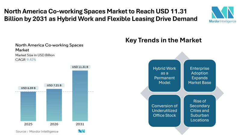 According to Mordor Intelligence, the North America co-working spaces market size was valued at USD 6.59 billion in 2025 and is estimated at USD 7.21 billion in 2026, projected to reach USD 11.31 billion by 2031, growing at a CAGR of 9.42%. This market growth reflects structural changes in how organizations use office space, especially as hybrid work becomes a long-term model rather than a temporary solution. Companies are prioritizing flexibility, cost control, and access to distributed talent, which is strengthening the North America co-working spaces industry across major cities as well as suburban locations.