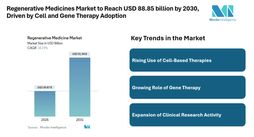 The regenerative medicines market is gaining strong momentum as healthcare systems focus on therapies that repair, replace, or regenerate damaged tissues and organs. According to Mordor Intelligence, The Regenerative Medicine Market size is estimated at USD 37.98 billion in 2025, and is expected to reach USD 88.85 billion by 2030, at a CAGR of 18.10% during the forecast period (2025-2030), reflecting steady expansion supported by clinical progress and wider acceptance of regenerative approaches. These therapies are increasingly used to address chronic diseases, genetic disorders, and injuries where conventional treatments offer limited outcomes.